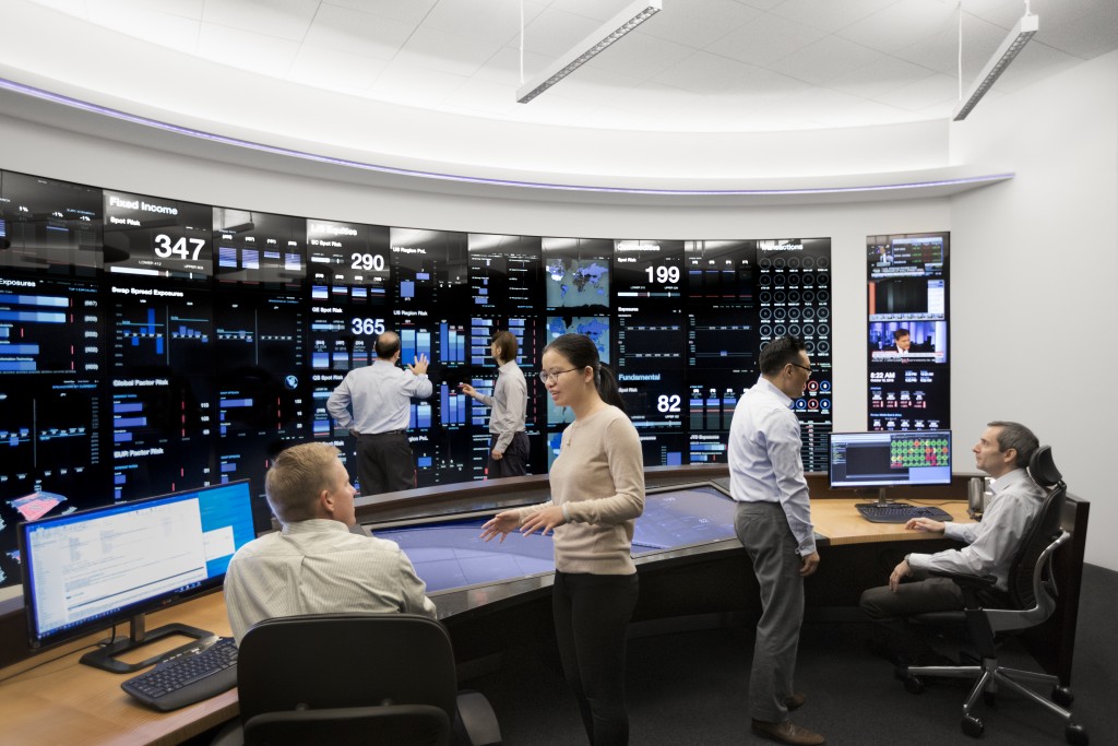 Pat Trade Risk Management Center provides a comprehensive view of the various investment portfolios and how they fit within pre-established guidelines. Built in 2014, its front-end consists of a 27’ by 8’ interactive touchscreen designed to visualize data in ways that allow for rapid comprehension. Its back-end systems, which connect to every Pat Trade office worldwide, continuously run a wide range of operational readiness, risk, and stress test monitors.